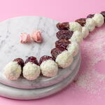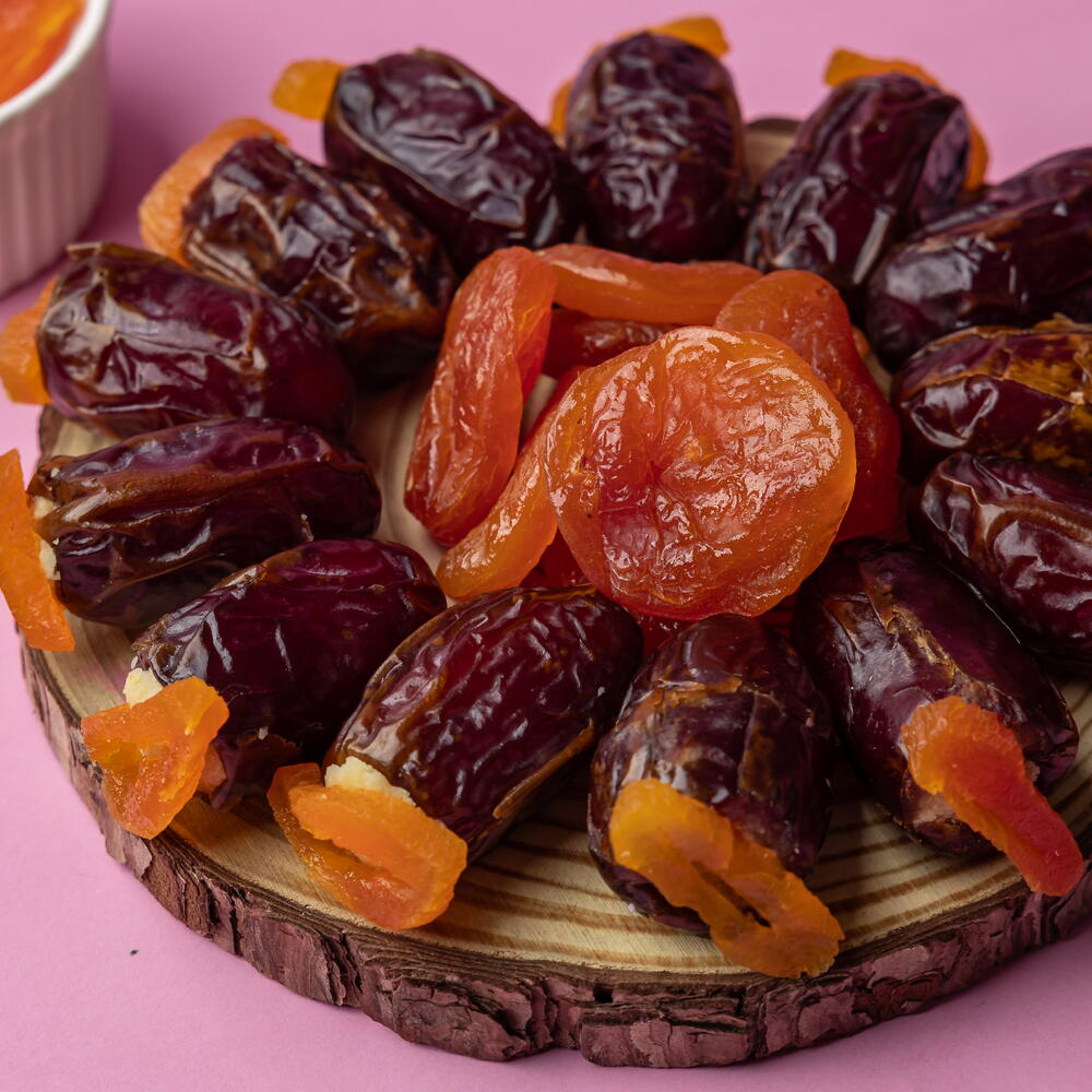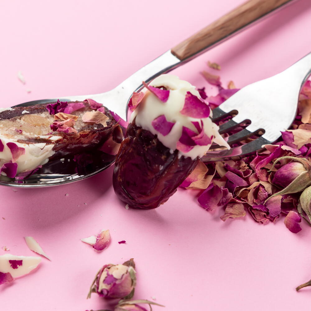 финики, миндальная паста, лимон, курага, грецкий орех, фисташка, белый шоколад, фундук, тёмный шоколад, лепестки роз и вода, цветок апельсина, кокосовый порошок, апельсиновая цедра