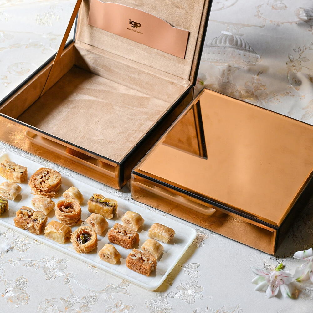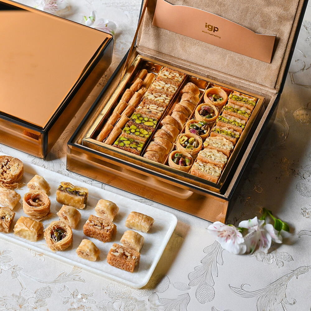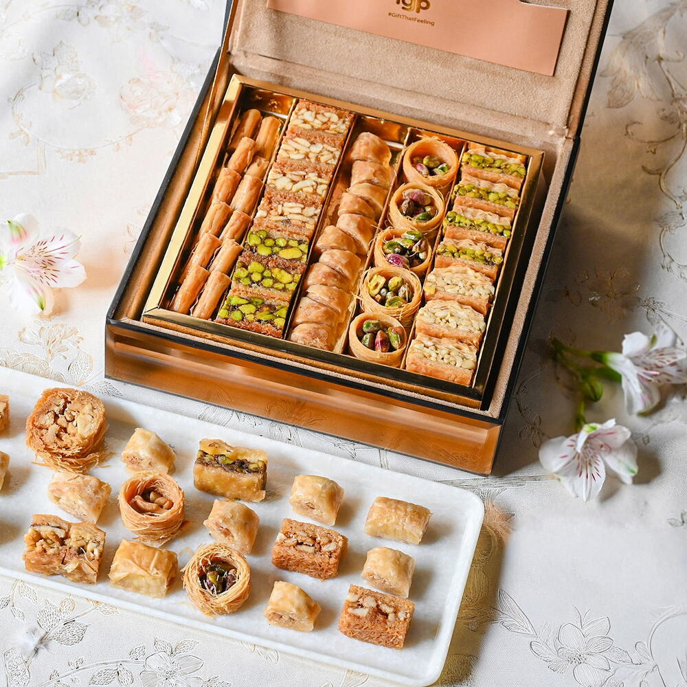 Премиальная баклава 250 г с нежными слоями и богатой начинкой из фисташек, грецких орехов и миндаля, предлагающая роскошный и аутентичный вкус.