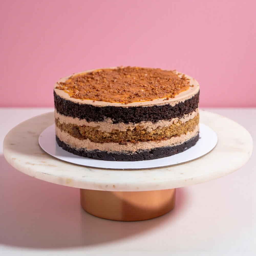 Встречайте вашу новую десертную страсть — Banana Brownie Popstar. Этот неотразимый торт сочетает насыщенную шоколадную основу брауни с мягким бананово-карамельным бисквитом и шелковистым шоколадным кремом, всё увенчано карамельной крошкой для идеального сладкого хруста. Насыщенный и удовлетворяющий вкусовой опыт — сладкий, слегка солоноватый и восхитительно тягучий. Идеально подходит для дней рождения, особых моментов или просто чтобы побаловать себя. На 4–6 человек.