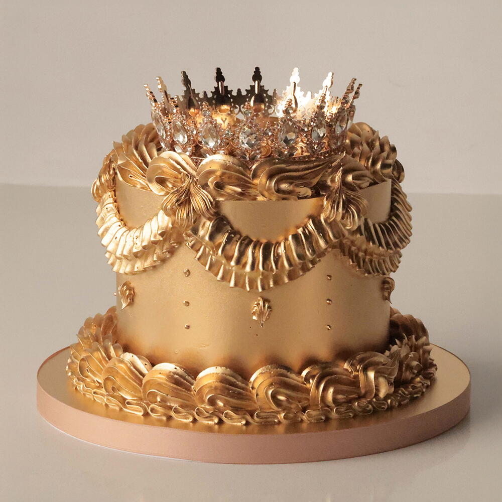 Our M cakes weighing 2.5 kg are designed for 9-10 people. The cake is adorned with delicate ganache ruffles and non-edible crown. Box size: 30*30*34cm