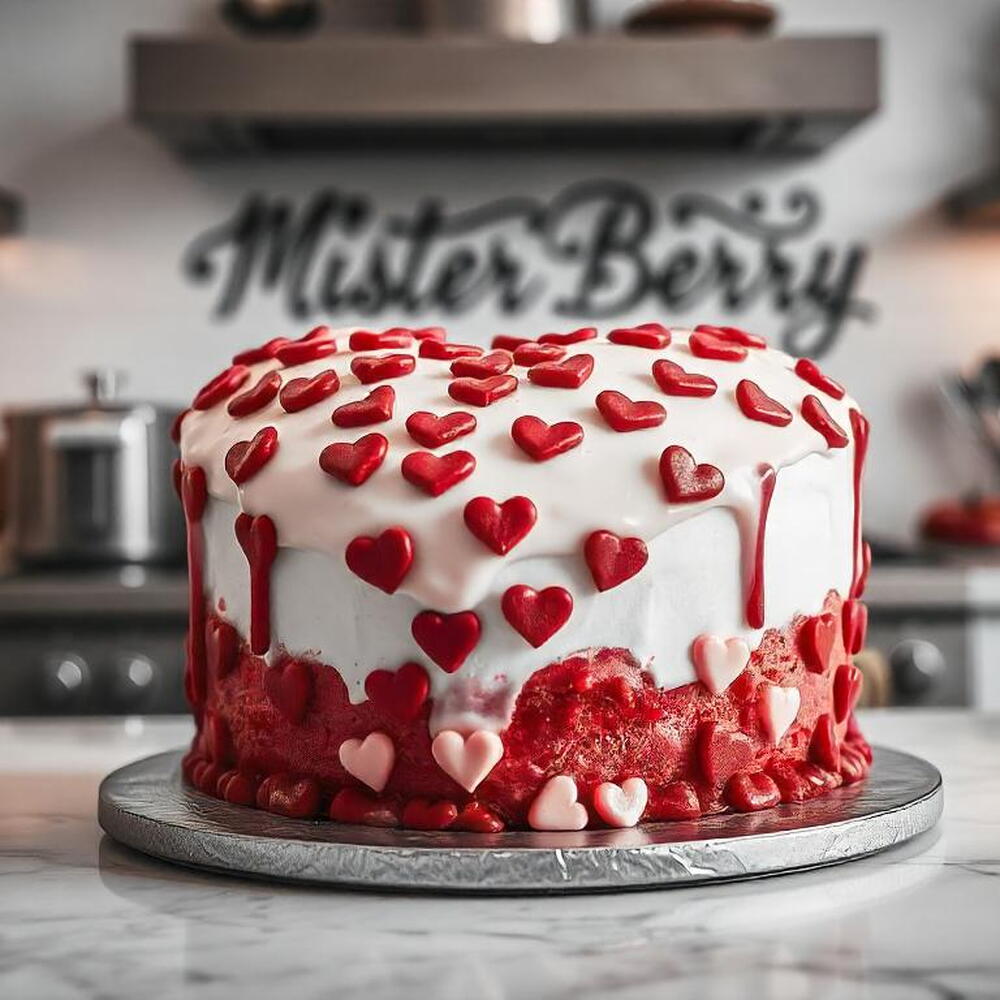 Торт в форме сердца с белой глазурью и красными украшениями в виде сердечек сверху. По бокам торта красная стекающая глазурь. Специальный торт ко Дню святого Валентина может сделать ваш день более захватывающим. Вы можете сделать свой День святого Валентина или любой другой день незабываемым с этим тортом. Этот торт сделан с любовью.
