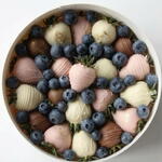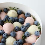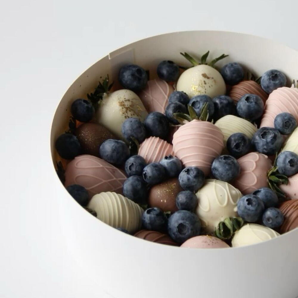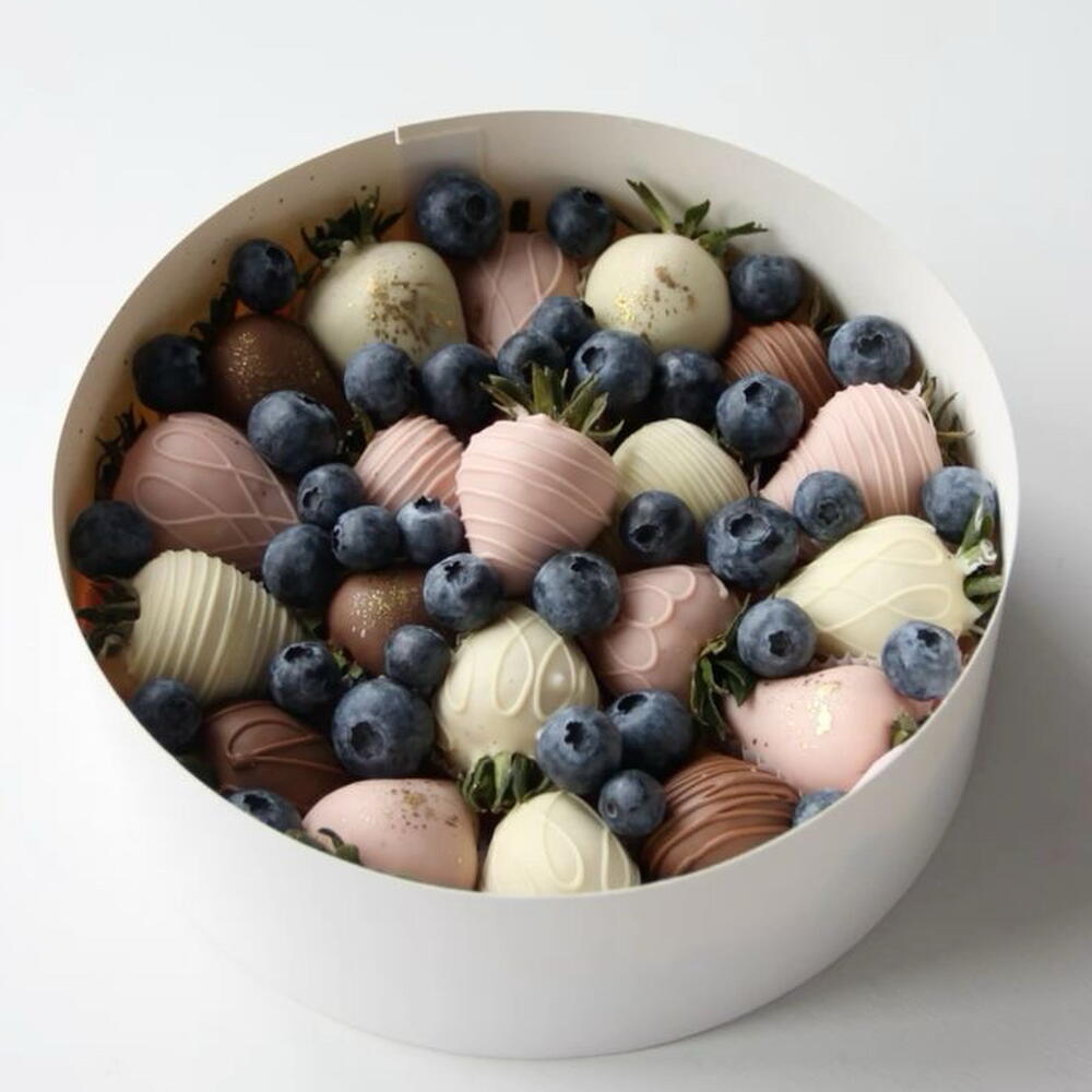 Handcrafted chocolate-covered strawberries paired with fresh blueberries in an elegant round gift box. Each strawberry is carefully dipped in premium milk, white, and ruby chocolate, then decorated for a luxurious look. Perfect for birthdays, romantic surprises, celebrations, or a sweet gift for someone special. • Fresh strawberries dipped in premium chocolate • Decorated with elegant chocolate drizzle and edible gold touch • Fresh blueberries for a balanced flavor • Beautiful round gift box presentation Made fresh on the day of delivery to ensure the best taste and quality.