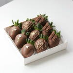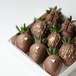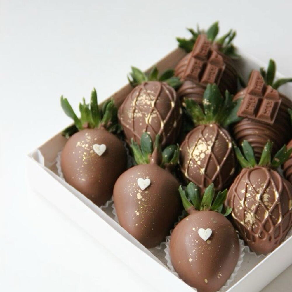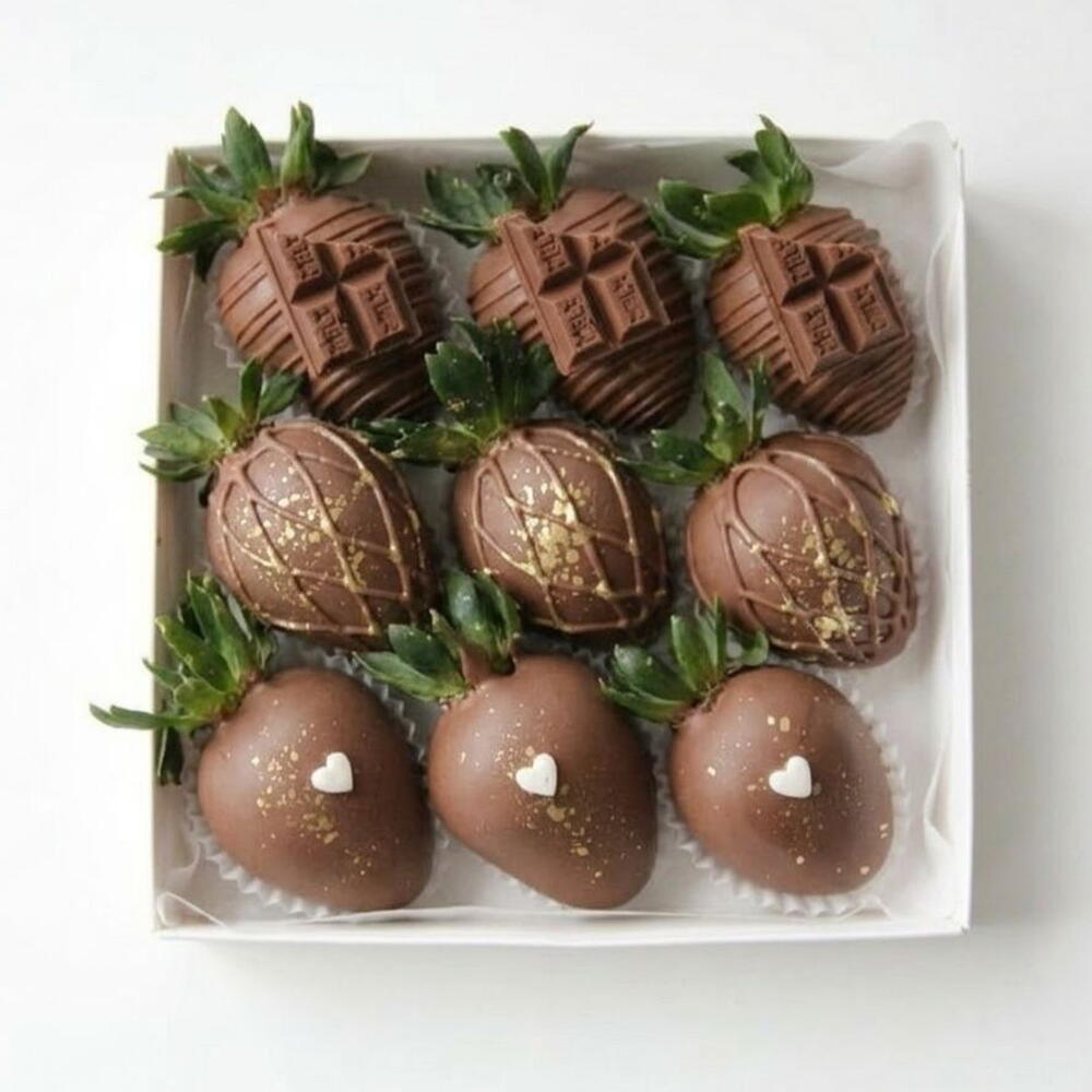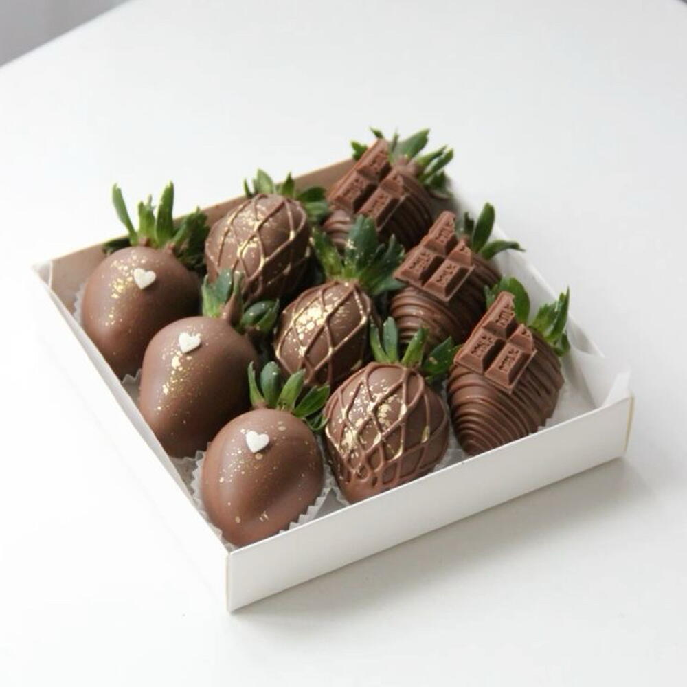 • 9 свежих клубник • Премиальный молочный шоколад • Шоколадные украшения • Украшение — брызги съедобного золота • Роскошная подарочная коробка