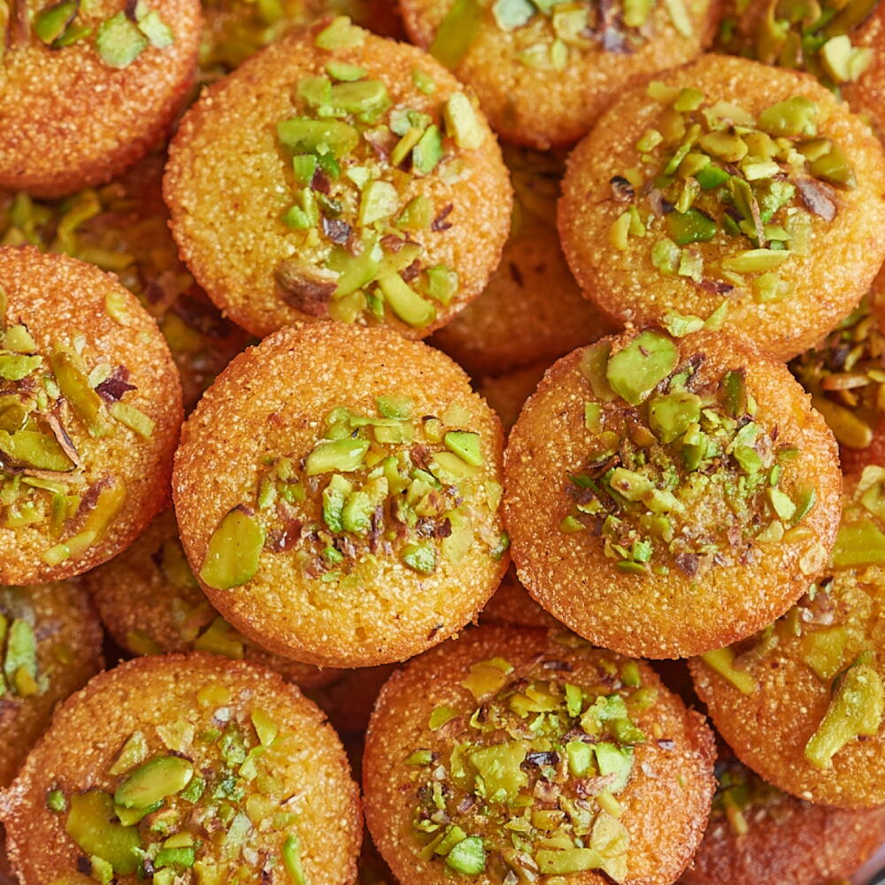Специальная басбуса с кардамоном и шафраном, сверху — смесь орехов. Содержит орехи, глютен и молочные продукты. (44 шт.)