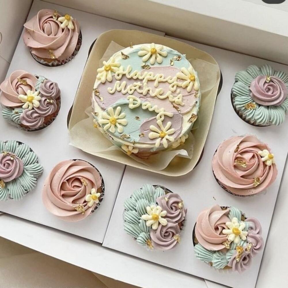 Это ванильный бисквит — воздушный и влажный. Между слоями — насыщенный баттерскотч и шарики баттерскотча для хруста, с белыми шоколадными чипсами. Украшен цветочным узором в пастельных тонах. Мини-торт вместе с 8 капкейками по разумной цене для подарка вашим близким.