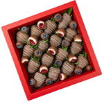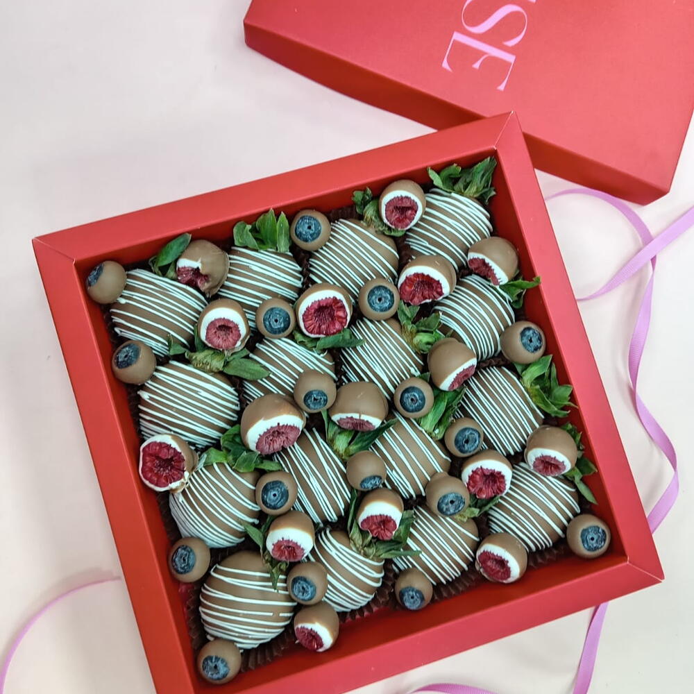 16 клубник в бельгийском молочном шоколаде с белыми полосками 17 малин в бельгийском молочном шоколаде 17 голубик в бельгийском молочном шоколаде