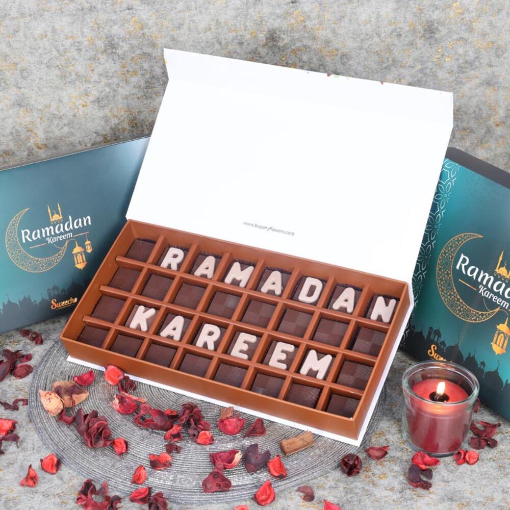 Информация о продукте: Бренд: Sweecho, Текст: Ramadan Kareem, Тип: Молочный шоколад, Количество: 32 шт., Мраморные шоколадные буквы, Разные вкусы: Фисташки, Чизкейк, Лотос, Фундук, Кофе, Кукурузные хлопья и Смесь орехов, Аллергены: Орехи и молоко, Упаковано в красивую подарочную коробку Рамадана.