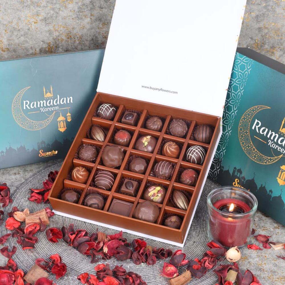 Информация о продукте: бренд: Sweecho, тип: молочный шоколад, количество: 25 шт., вкусы: фисташки, кофе, фундук, соленая карамель, корица и т. д., аллергены: орехи и молоко, упаковано в красивую подарочную коробку к Рамадану.