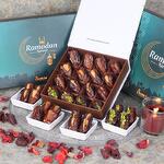 Информация о продукте: ассорти из фаршированных фиников со вкусами: фисташки, апельсиновая цедра, кешью и грецкий орех. Количество: 16 шт., упаковано в красивую подарочную коробку к Рамадану.
