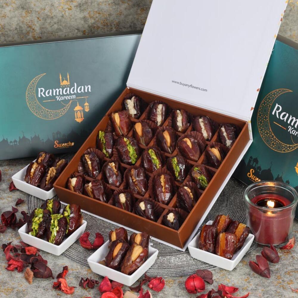 Информация о продукте: ассорти из фаршированных фиников со вкусами: фисташки, апельсиновая цедра, кешью, грецкий орех и фундук. Количество: 25 шт., упаковано в красивую подарочную коробку к Рамадану.