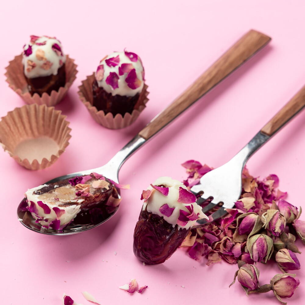 Финики, фаршированные уникальными натуральными ингредиентами, вдохновлёнными вкусами со всего мира: ТРЮФЕЛЬНЫЙ ФИНИК Финик Медждуль, фаршированный тёмным шоколадом и фундучной пастой ИЗУМРУД Финик Медждуль, фаршированный кремом из фисташек и белого шоколада СЛАДКАЯ КОЖУРА Финик Медждуль, фаршированный миндальной пастой и апельсиновыми цукатами БЕЛОСНЕЖКА Финик Медждуль, фаршированный кокосом и белым шоколадом ЗОЛОТОЙ ЧАС Финик Медждуль, фаршированный абрикосом, лимоном и миндальной пастой РОЗА ПУСТЫНИ Финик Медждуль, фаршированный миндальной и ореховой пастой со вкусом розовой воды Состав: финики, миндальная паста, лимон, курага, грецкий орех, фисташки, белый шоколад, фундук, тёмный шоколад, лепестки роз и вода, цветки апельсина, кокосовый порошок, апельсиновая цедра