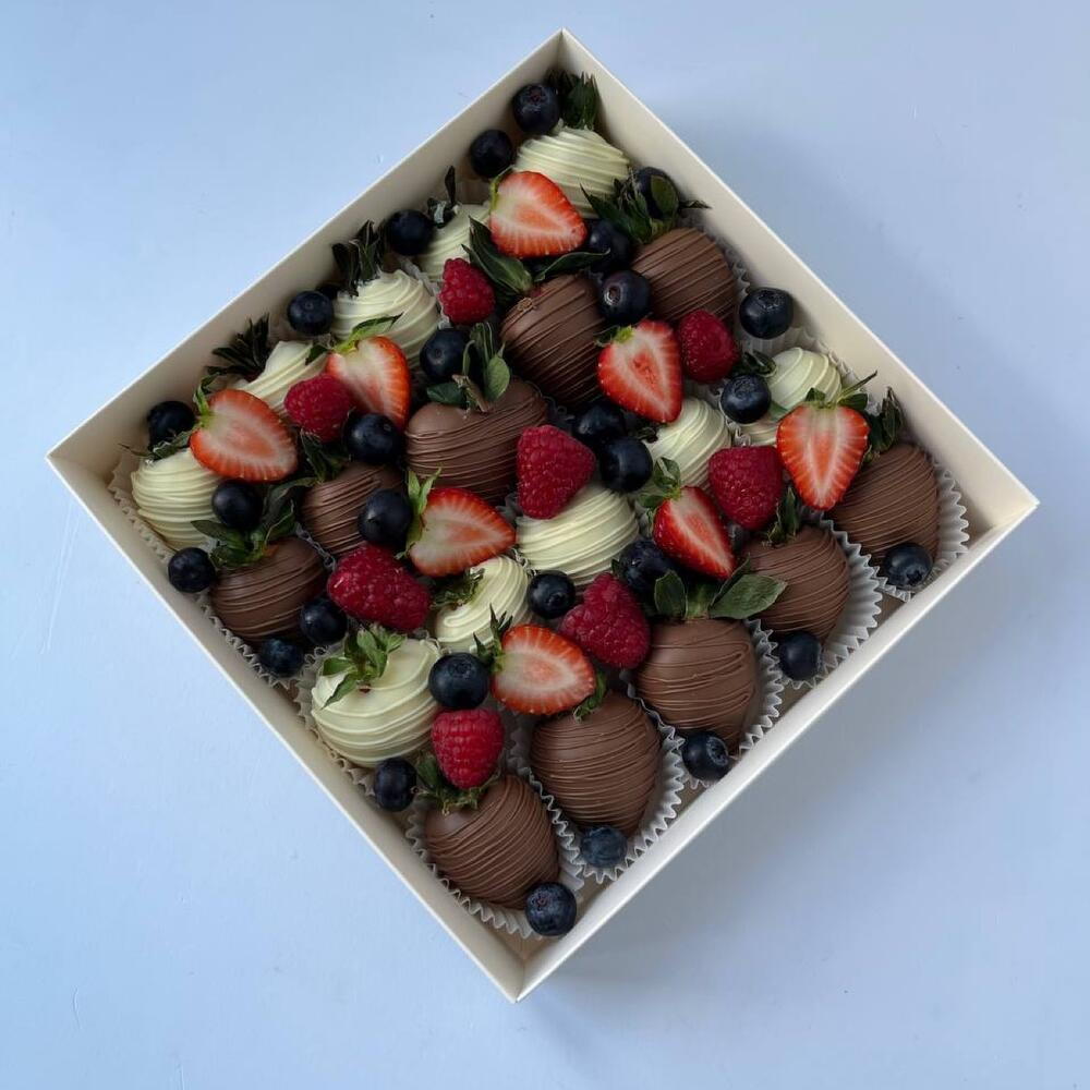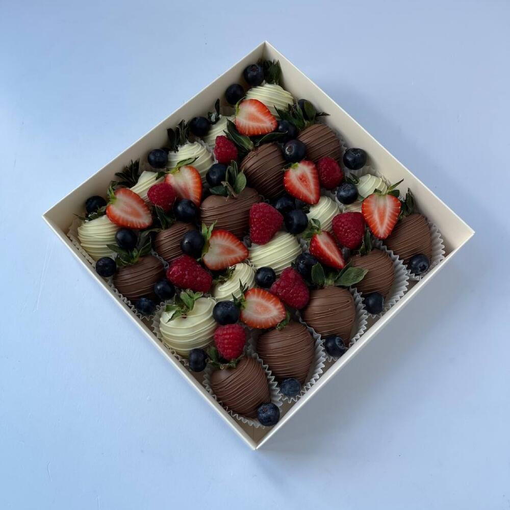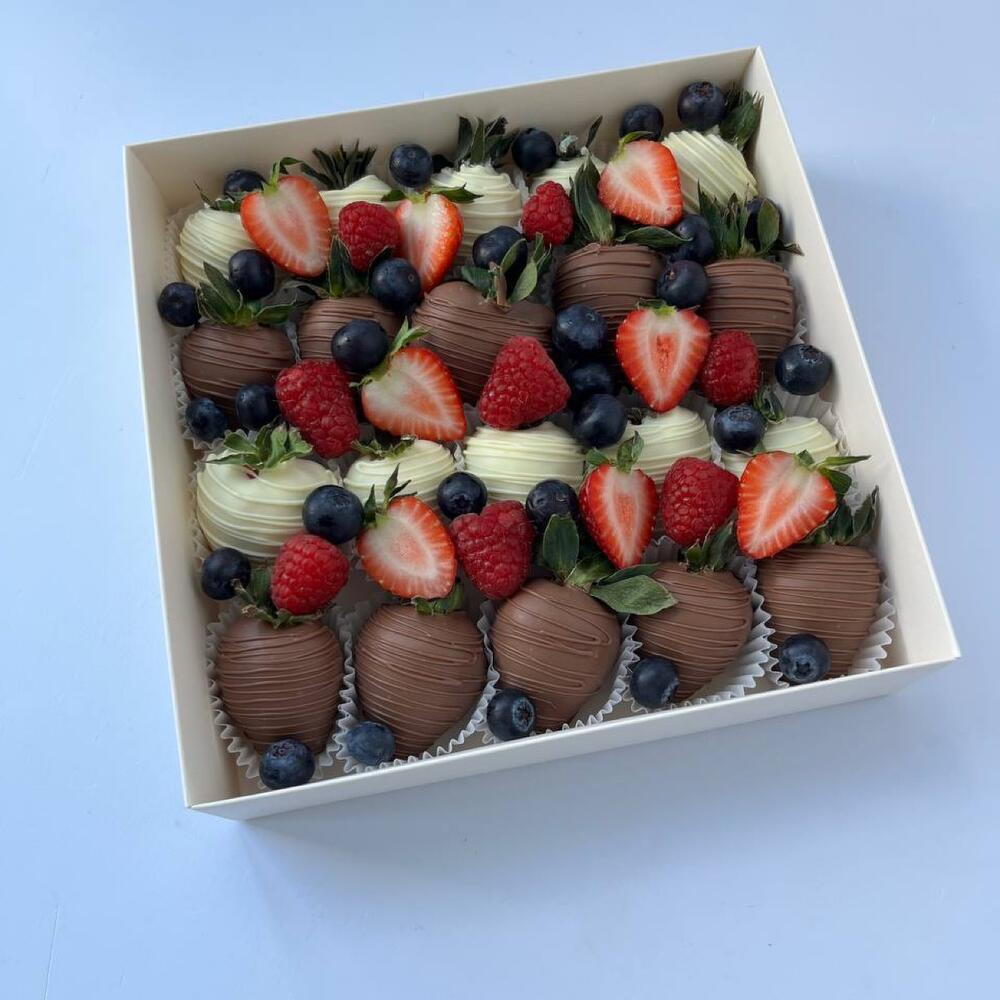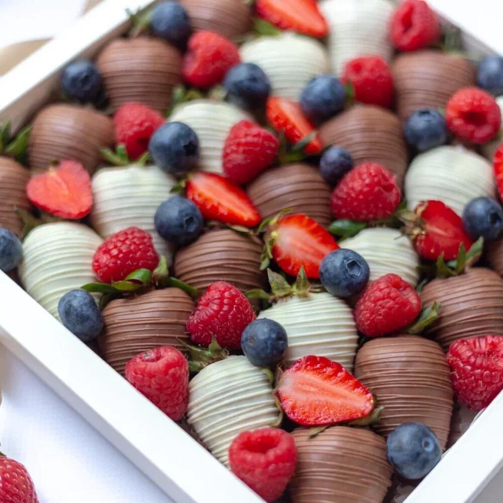 Представляем вашему вниманию изысканный набор клубники, покрытый нежнейшим молочным и белым шоколадом. Каждая ягодка – маленький шедевр, украшенный яркими кусочками свежей клубники, сочной черники и ароматной малины. Этот сладкий десерт не только радует глаз, но и дарит неповторимый вкус, сочетая сладость шоколада с кисло-сладкими нотками ягод. Идеальный выбор для романтического ужина, праздника или просто чтобы побаловать себя и близких. Позвольте себе насладиться этим великолепием! Рекомендуем употребить десерт в течение первых 12 часов после получения. При необходимости хранить в холодильнике при температуре от +4 до +10°C не более 24 часов. Перед употреблением выдержать при комнатной температуре 15 минут. Приятного аппетита!
