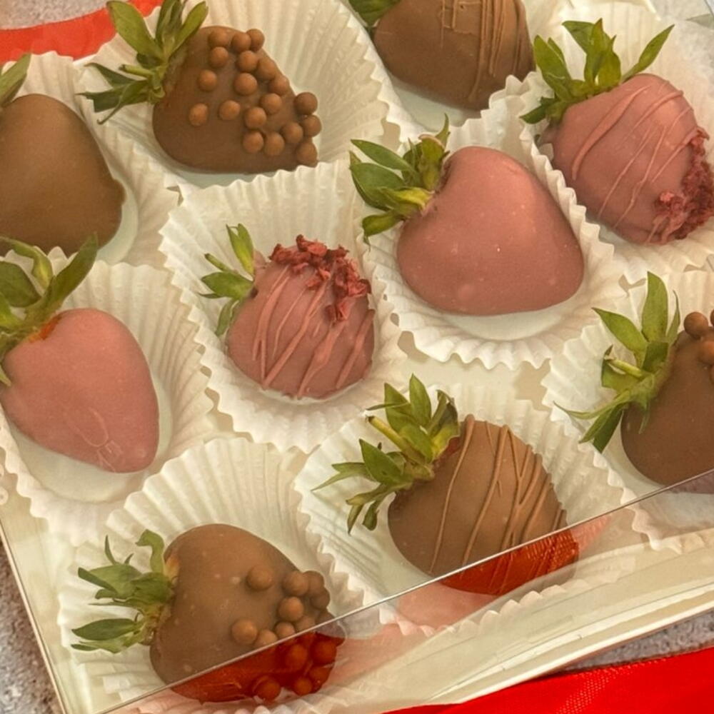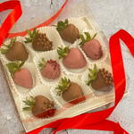 Fresh strawberry, milk chocolate, freeze-dried raspberry, coconut. Strawberries in chopped chocolate, in pink chocolate, in chocolate mix.