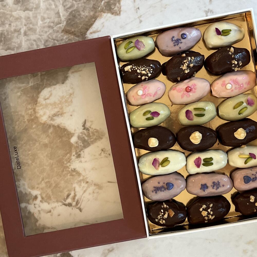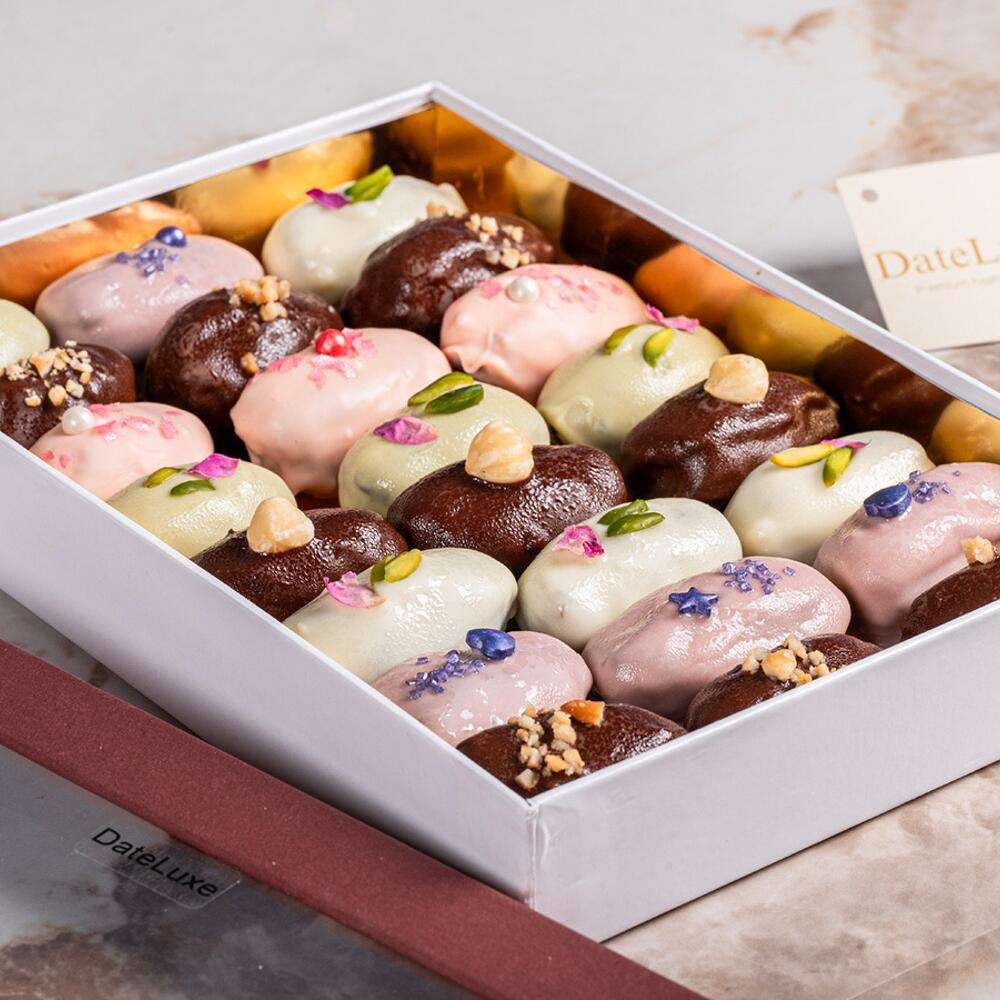 Побалуйте себя роскошным сочетанием традиций и декаданса с нашими финиками Мадждул, фаршированными орехами и ароматизированным кремом, покрытыми шоколадом (6 вкусов)