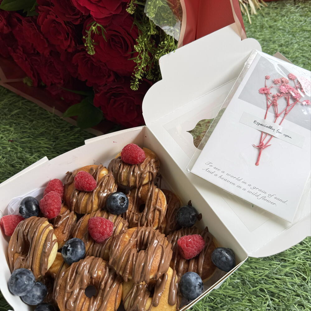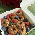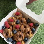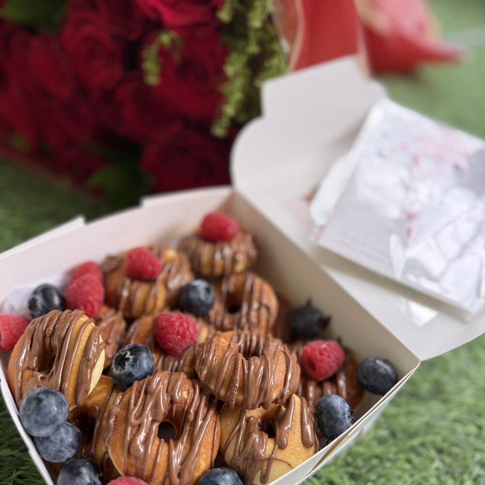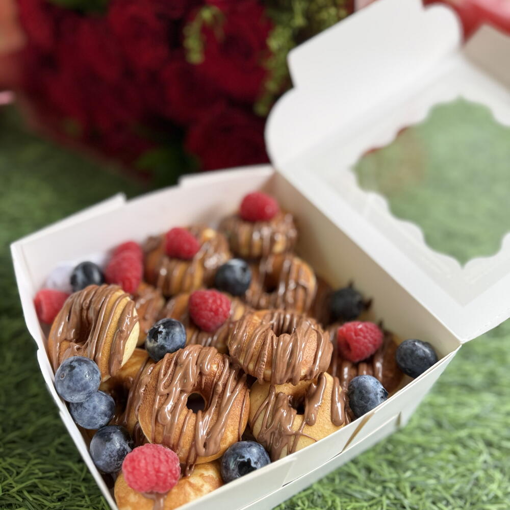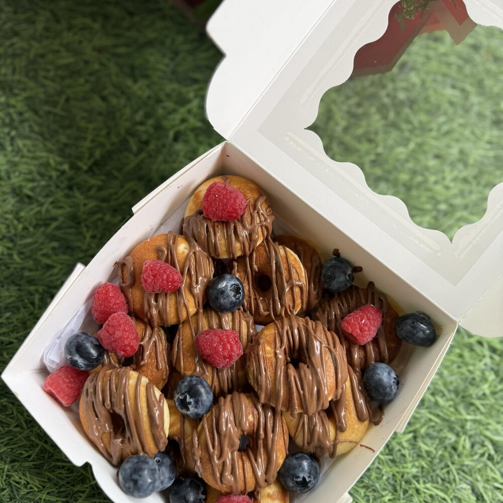 Мягкие мини-пончики, приготовленные из муки, сахара, яиц, молока, сливочного масла и разрыхлителя, покрытые сливочной Нутеллой (фундук, какао, сахар) и свежими сочными черникой и малиной.