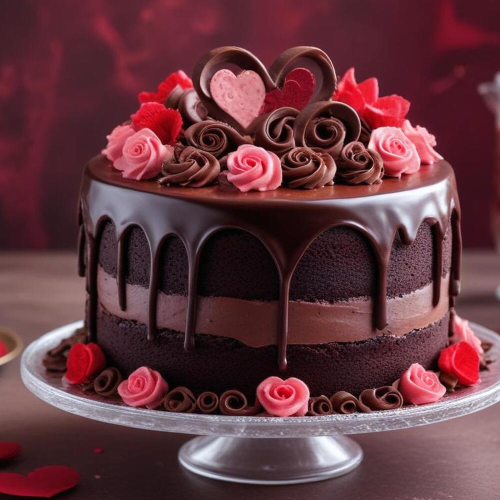 Многослойный шоколадный торт с шелковистым шоколадным ганашем, посыпкой из какао и декоративными шоколадными завитками с крошечными розочками из вкусного сладкого крема. Этот торт ко Дню шоколада — настоящее удовольствие для любителей шоколада, и этот прекрасный торт лучше всего подходит в качестве сюрприз-подарка на День святого Валентина для вашего особенного человека.