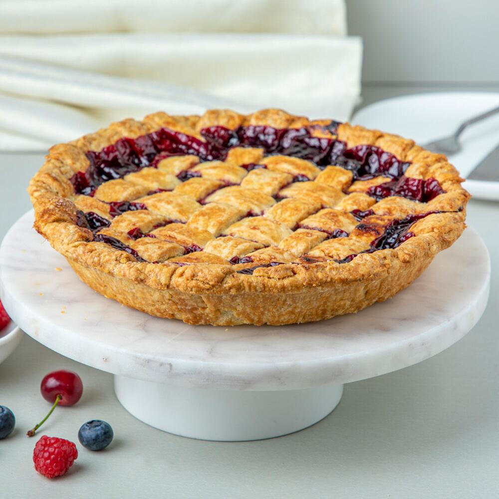 Идеальное сочетание черники, малины, клубники и вишни в сладкой начинке, запечённое в нашей слоёной корочке и украшенное решётчатой корочкой. 8 дюймов, на 6-8 человек.