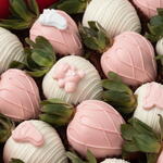 8 ягод клубники в бельгийском белом шоколаде 8 ягод клубники в розовом бельгийском шоколаде Украшено шоколадными фигурками в виде ножки младенца, мишки и детской одежды