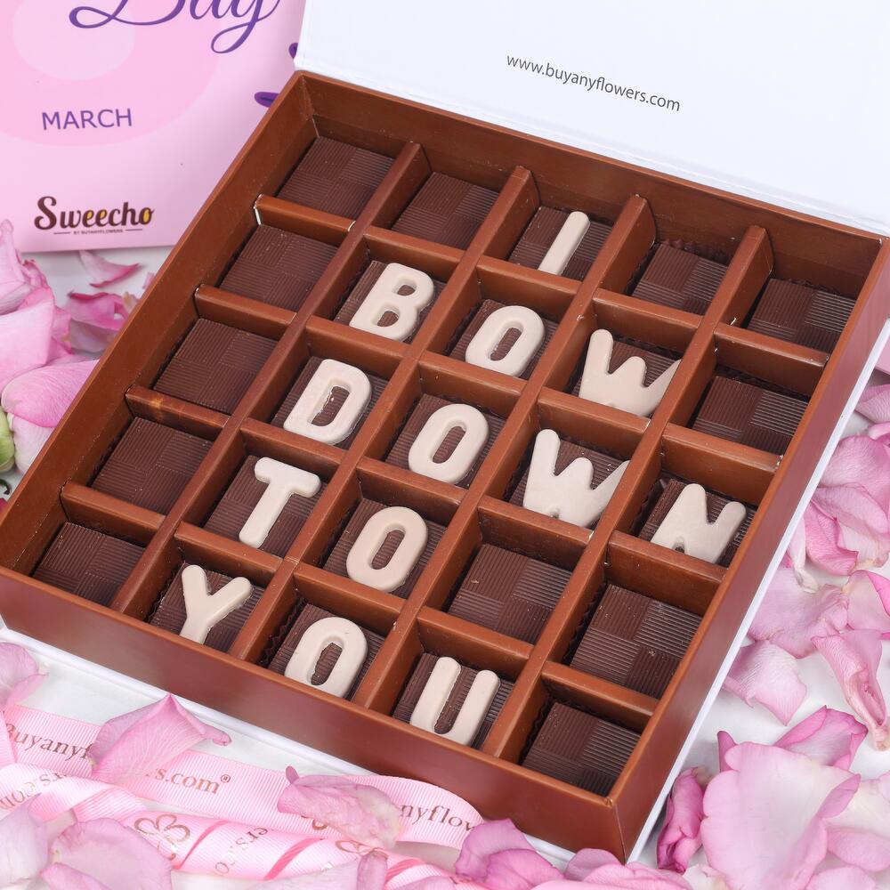 Бренд - Sweecho, Текст - Я преклоняюсь перед тобой, Тип - молочный шоколад, Количество - 25 шт, Мраморные шоколадные буквы, Ассорти вкусов - фисташка, чизкейк, арахис, карамель и вафли, Аллергены - орехи и молоко, Оформлено в красивой подарочной коробке.