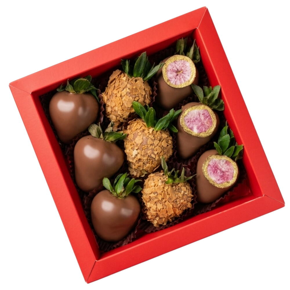 3 клубники, покрытые бельгийским молочным шоколадом с золотой пылью 3 клубники, покрытые бельгийским молочным шоколадом с французскими хрустящими флюэнтинами 3 клубники, покрытые бельгийским молочным шоколадом с сублимированными инжирами