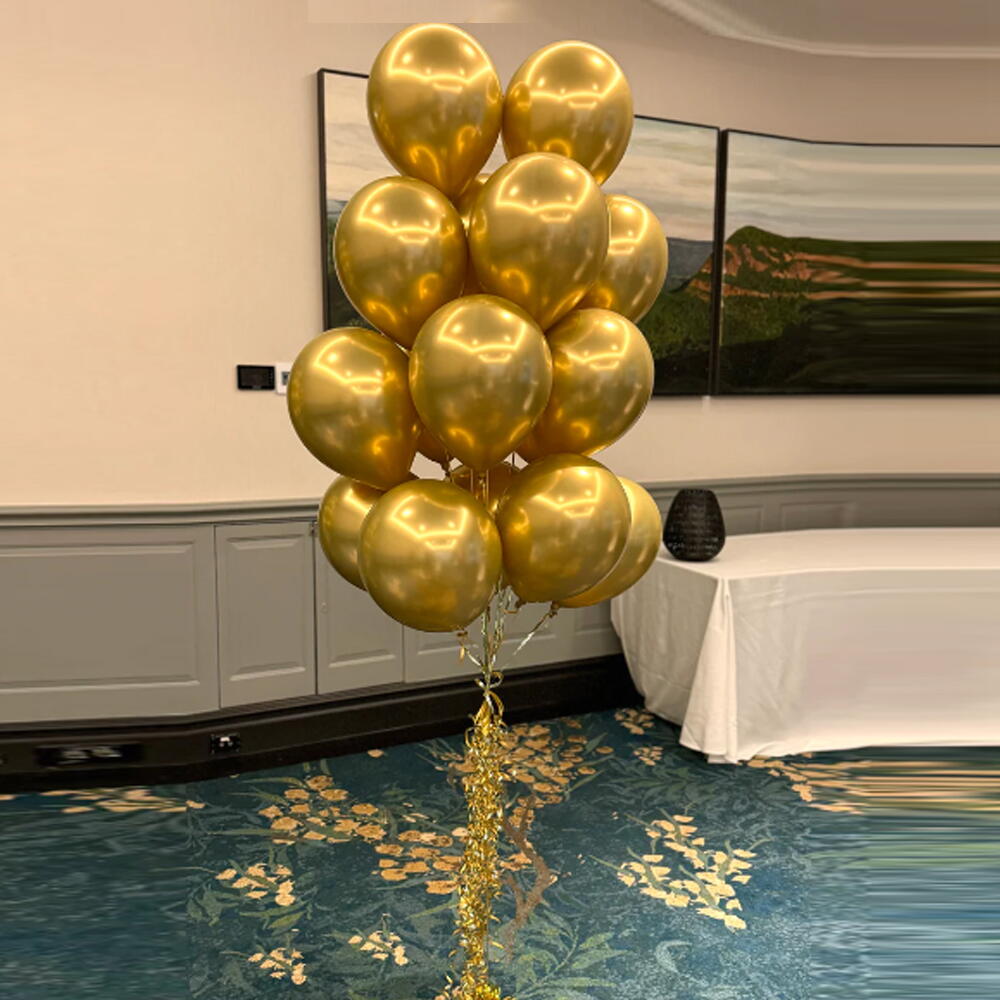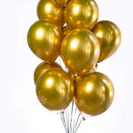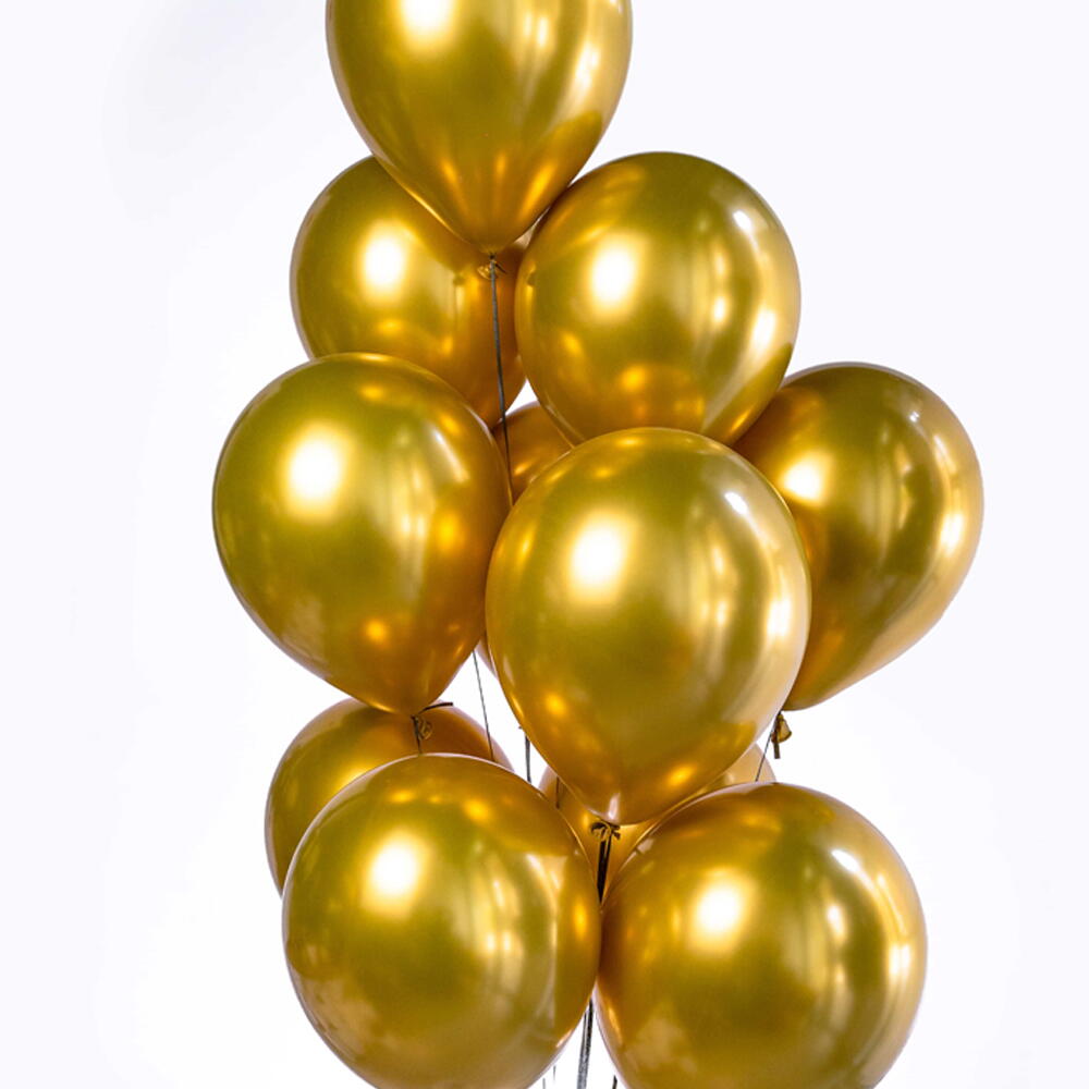 Золотые хромированные шары -15 шт Наполнены гелием Завязаны лентой Время полёта будет 6-8 часов, зависит от температуры