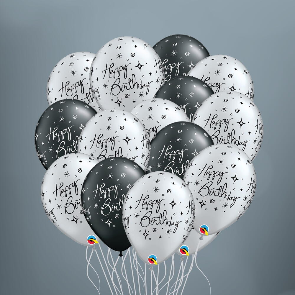 15 высококачественных американских фирменных чёрно-серебристых блестящих шаров на день рождения, наполненных гелием, с утяжелителем внизу. Гелий держится 6-8 часов.