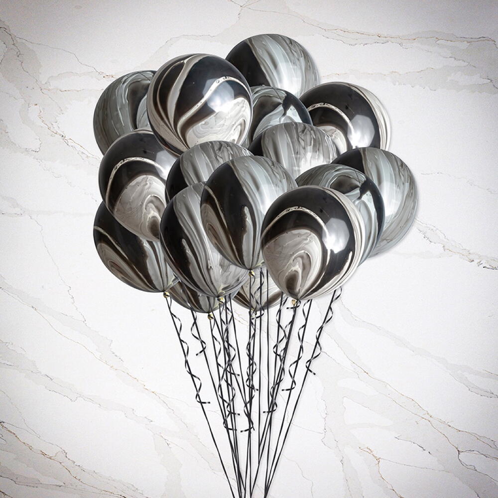 21 шар с мраморным дизайном, с гелием и грузиком. Гелий продержится 6–8 часов.