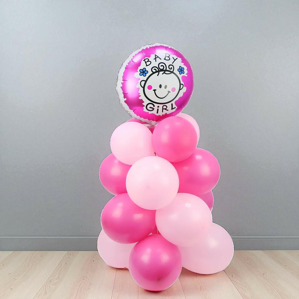 10 светло-розовых шаров 10 тёмно-розовых шаров Собраны в колонну из шаров с шаром Baby girl наверху Наполнены воздухом Примерная высота : 100 - 120 см В зависимости от места размещения шары будут держаться в воздухе до 8 часов