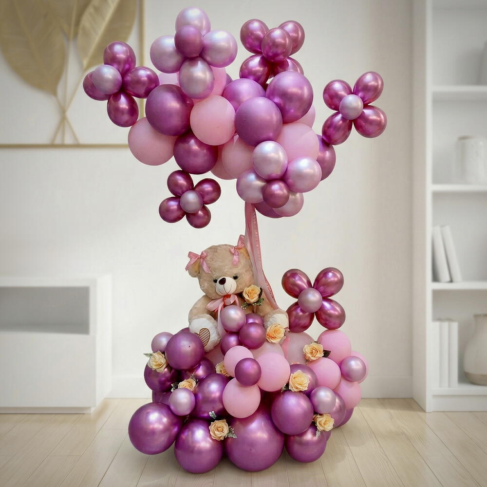 Celebrate the arrival of a precious baby girl with this adorable balloon arrangement, thoughtfully designed to add charm and joy to any space. This setup features a cute 30cm teddy bear placed on a stylish stand, creating a sweet focal point for your decoration. The arrangement includes 16 soft pink latex balloons (10 inches) and 60 elegant chrome pink balloons (5 inches), beautifully styled to give a full and luxurious look. To enhance the overall appeal, 6 artificial roses are added, bringing a delicate and graceful touch. Perfect for newborn celebrations, hospital room decoration, baby showers, or welcome home setups, this arrangement creates a warm and loving atmosphere for the special occasion. A delightful way to welcome your little princess with love and elegance. *Customization is possible as per your preference.