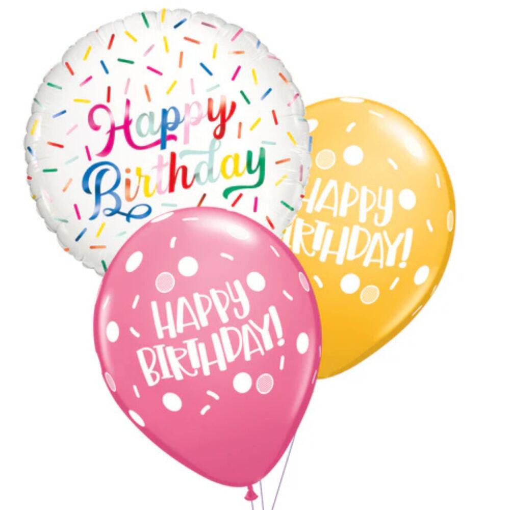 Отмечайте с шаром Birthday Sprinkles, украшенным милыми пожеланиями Happy Birthday, доступным в виде настольной композиции из 3 шаров. Шары держатся в воздухе не менее 3 дней, есть возможность добавить подарочное сообщение. Дизайн может отличаться в зависимости от наличия шаров.