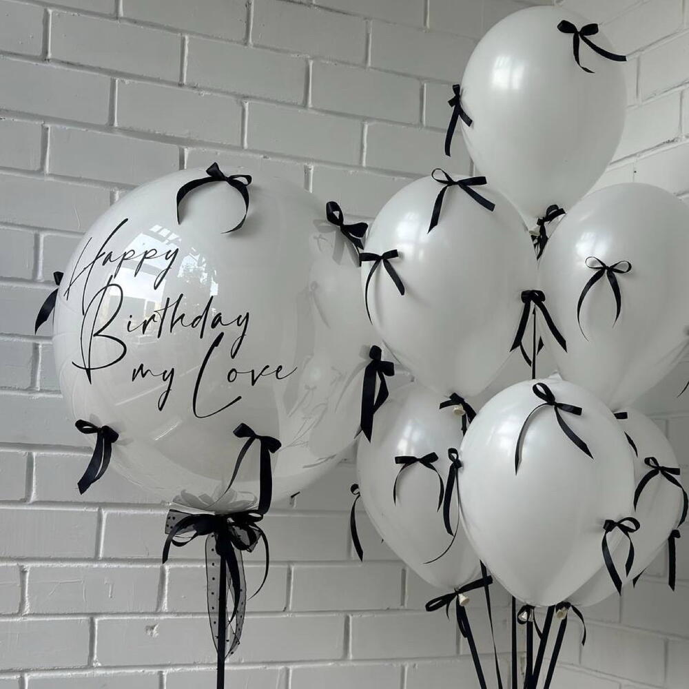 Set includes: - double stuffed bubble balloon - custom writing - 7 latex balloons - black bows