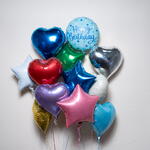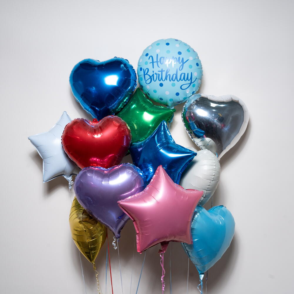 Яркий букет, наполненный гелием, включает 1 шар «С Днём Рождения», 6 шаров в форме звезды и 6 шаров в форме сердца различных цветов. Идеально подходит для дней рождения и праздников, этот эффектный набор поставляется надутым гелием, с лентами и грузиком у основания. ⏱️ Время полёта на гелии: примерно 8–10 часов.