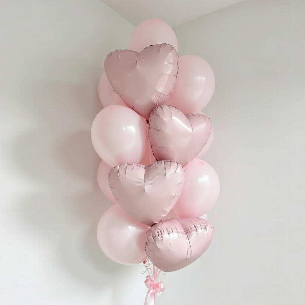 Нежный и элегантный букет воздушных шаров пудрово-розового оттенка, создающий мягкую и романтичную атмосферу. Этот набор включает 9 × нежно-розовых латексных шаров и 4 × пудрово-розовых фольгированных шара в форме сердца, аккуратно сочетанных для достижения сбалансированного, объёмного и роскошного вида. Глянцевые фольгированные шары в форме сердца придают изысканный блеск, в то время как нежно-розовые латексные шары обеспечивают объём и мягкость, делая букет визуально насыщенным и идеально пропорциональным. Профессионально собран и доставляется полностью надутым гелием, завершён подходящей розовой лентой и оснащён надёжным грузиком для устойчивости. Идеально подходит для дней рождения, празднования рождения девочки, девичников, романтических сюрпризов, помолвок и премиального оформления мероприятий.