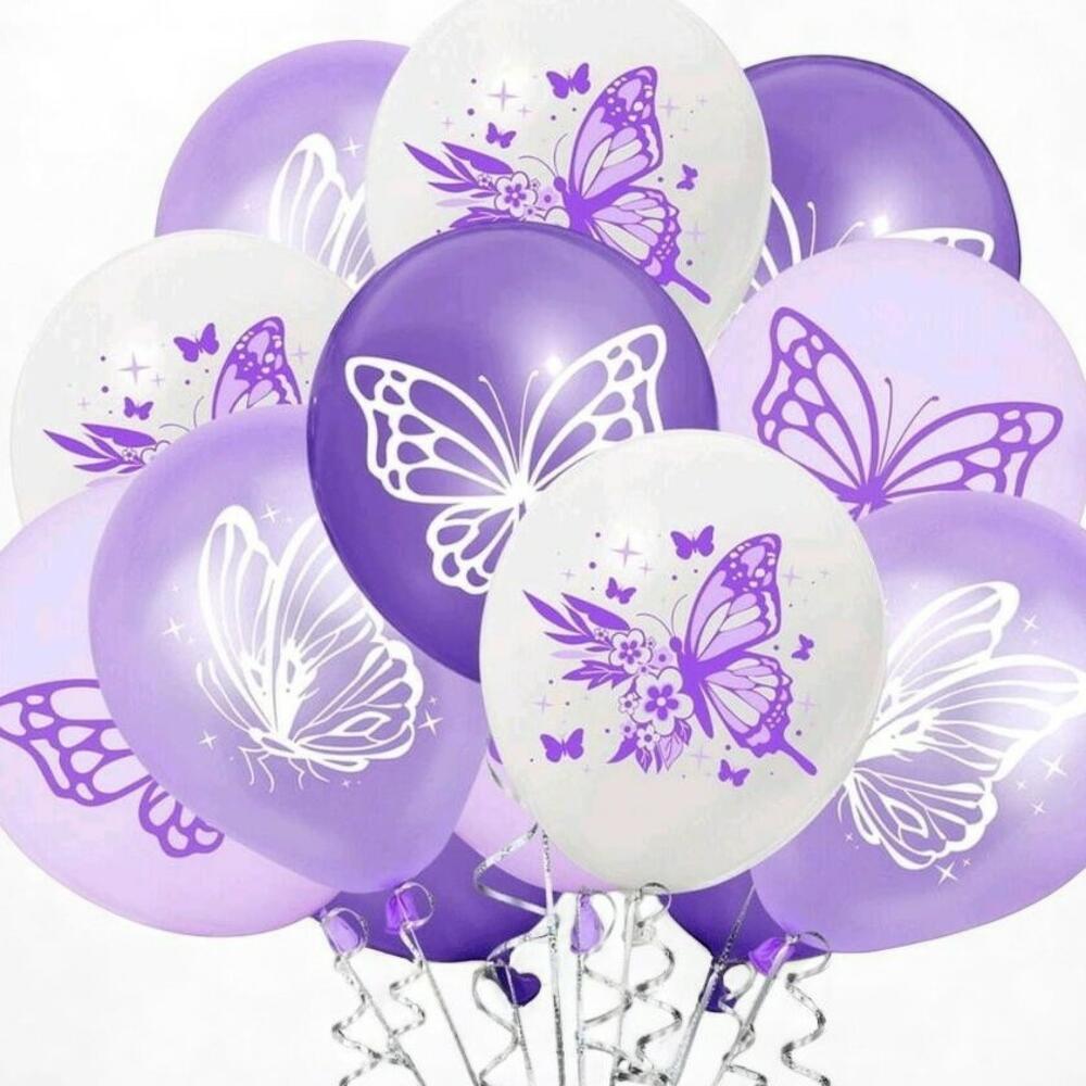 Bring a touch of magic and elegance to any celebration with this beautiful bouquet of balloons featuring intricate butterfly prints in soft lavender, violet, and ivory hues. Perfect for birthdays, baby showers, or fairy-themed parties, these balloons add an air of whimsy and charm to your event. Their gentle color palette and sparkling details are sure to enchant guests of all ages. Keep the balloons away from heat sources and sharp objects to preserve their shape and shine. For best results, inflate just before your event and store in a cool, dry place. Will fly 3/5 days. Depending on the temperature in your home or car, helium can expand. Subsequently, the balls may burst. To prevent this from happening, we pack them in large bags. We are not responsible for balloons that burst upon delivery.