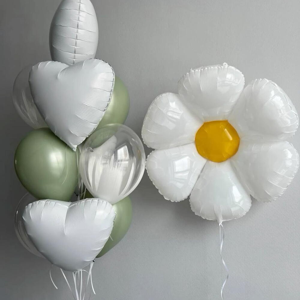 1 Big Camomile A bunch: 4 white hearts 3 clear balloons 3 olive balloons