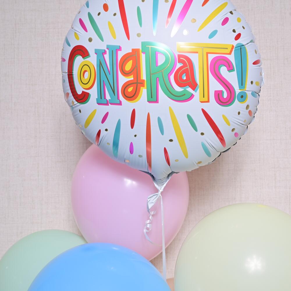 Отпразднуйте со стилем яркой смесью латексных и фольгированных шаров, наполненных гелием, которые держатся в воздухе 8–10 часов. Латексные шары × 6 Фольгированный шар Congrats × 1