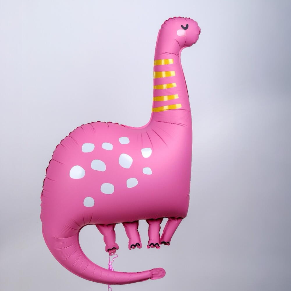 Этот розовый фольгированный шар в виде брахиозавра придаёт любому празднику весёлый и милый доисторический штрих. Он наполнен гелием и оснащён грузиком внизу для устойчивости; идеально подходит для вечеринок в стиле динозавров и детских дней рождения. Гелий держится примерно 8–10 часов.