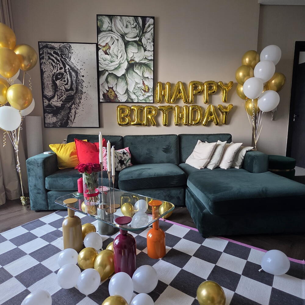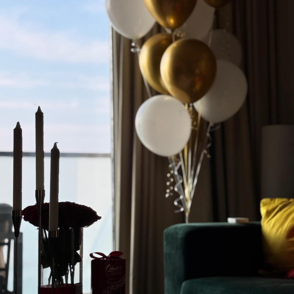 Преобразите ваш дом в великолепное место для празднования дня рождения с нашей элегантной услугой декора в Абу-Даби. В оформление входят премиальные золотые и белые шары, стильный фон с надписью «HAPPY BIRTHDAY» и красиво скоординированная композиция, созданная для современных интерьеров. Мы берем на себя всё — от доставки до полной установки — чтобы вы могли расслабиться и наслаждаться идеально подготовленным праздником прямо в своей гостиной. Идеально подходит для камерных дней рождения, сюрпризов и домашних вечеринок. Включено: Шары с надписью «Happy Birthday» 20 гелиевых шаров Свежая красная роза в вазе Подсвечник на 3 свечи и свечи 20 мини золотых 20 мини белых 1 коробка Lindor Доступно по всему Абу-Даби.