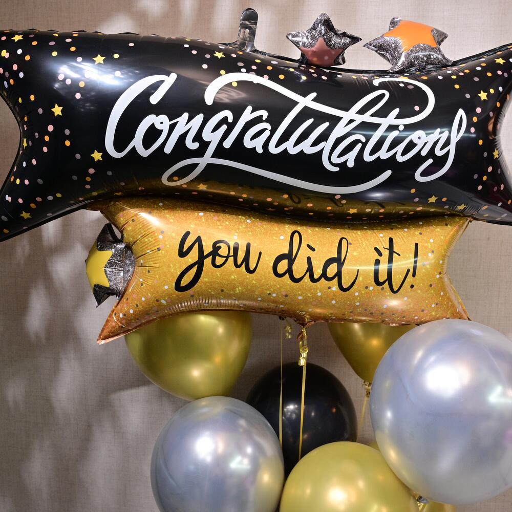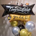 Отпразднуйте выпускной с этим праздничным набором шаров, включающим 1 фольгированный шар и 8 латексных шаров. На фольгированных шарах размещены надписи Поздравляем и Вы это сделали! в элегантном черно-золотом оформлении, идеально подходящем для поздравления выпускника. Сопровождающие латексные шары серебристого, золотого и черного цветов дополняют тему, добавляя яркости и очарования празднику.
