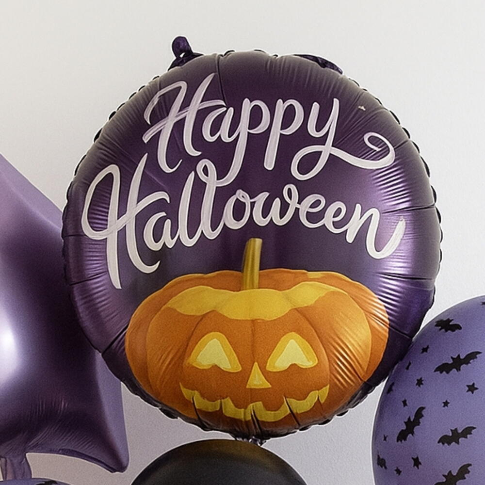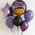 Зловещий шик: букет воздушных шаров «Счастливого Хэллоуина» Погрузитесь в хэллоуинскую атмосферу с этим элегантным и праздничным букетом воздушных шаров! Идеальный центральный элемент или подарок для любого празднования Хэллоуина — в этом букете изысканное сочетание фиолетового и чёрного, выходящее за рамки традиционного оранжевого и чёрного. 1 круглый фольгированный шар 18 1 фольгированный шар в форме звезды 18 5 латексных шаров 12