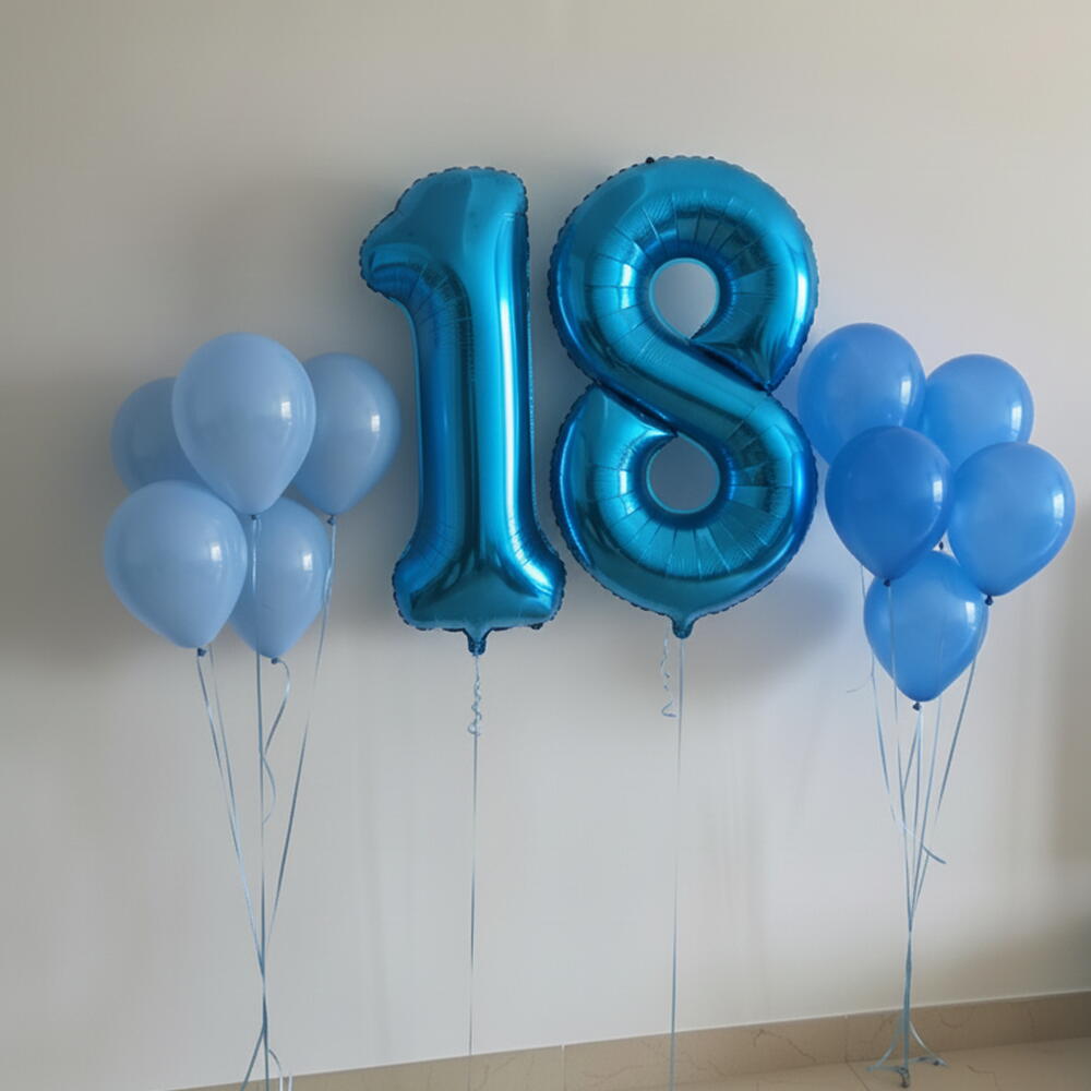 Два шарика цифры 1 и 8 по 40 каждый 4 светло-голубых латексных шара по 12 каждый 4 тёмно-синих латексных шара по 12 каждый