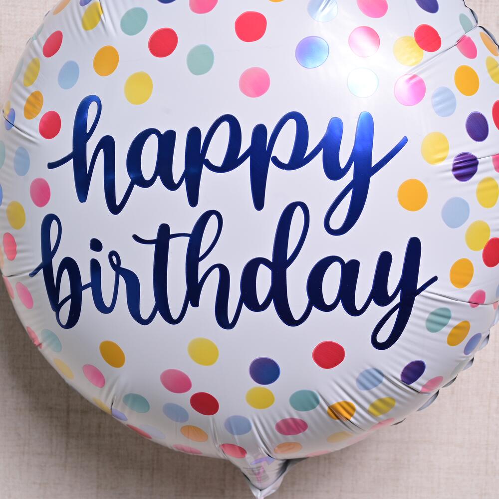 Отпразднуйте с ярким круглым фольгированным шаром «Happy Birthday», наполненным гелием и снабжённым грузиком для установки. Идеален для декора вечеринки или подарка-сюрприза. Держится в воздухе 8–10 часов.