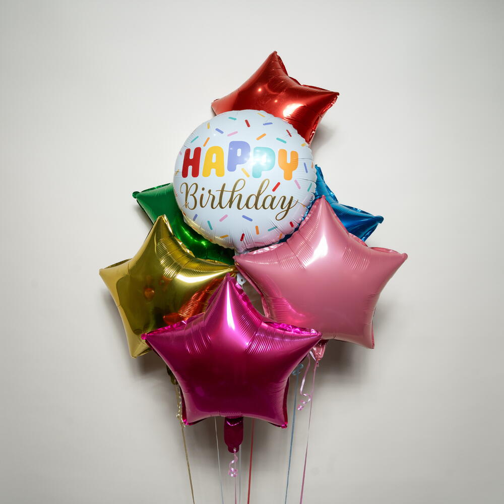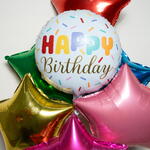 Этот набор фольгированных шаров «С Днём Рождения» с посыпкой (6 шаров в форме звезды) придаёт яркий и праздничный акцент любому празднованию дня рождения. В набор входит 1 круглый фольгированный шар «С Днём Рождения» с посыпкой, дополненный 6 фольгированными шарами в форме звезды ярко-красного, зелёного, золотого, синего, розового и ярко-розового цветов для красочного многослойного эффекта. Идеально подходит для дней рождения, праздничного декора и фотомоментов, этот набор из 7 фольгированных шаров создаёт весёлую и радостную атмосферу и обеспечивает время полёта на гелии примерно 8–10 часов 🎈✨