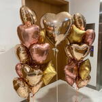 This unique bouquet will be a great decoration for any special event and will create a bright and joyful atmosphere. 1 foil rose gold heart shape balloon 30 with white inscription on the white ribbon and with weight 2 bunches with weights: 5 foil gloss rose gold heart shape balloons 18 5 foil satin rose gold heart shape balloons 18 2 foil gold satin star shape balloons 20 You can change the inscription to your own. Product color may slightly vary due to photographic lighting sources or your monitor settings. All latex balloons are treated with hi-float for long flight. Also, the customer can be offered a replacement for a similar product.