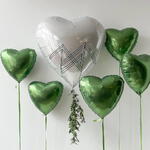 A set of birthday balloons that will be a real gift and a great photo zone! All balloons with separate weights and different lengths of ribbons: 5 foil green hearts 18” 1 foil white heart 30” with black inscription, with leaves You can change the inscription to your own. Product color may slightly vary due to photographic lighting sources or your monitor settings. All latex balloons are treated with hi-float for long flight. Also, the customer can be offered a replacement for a similar product.