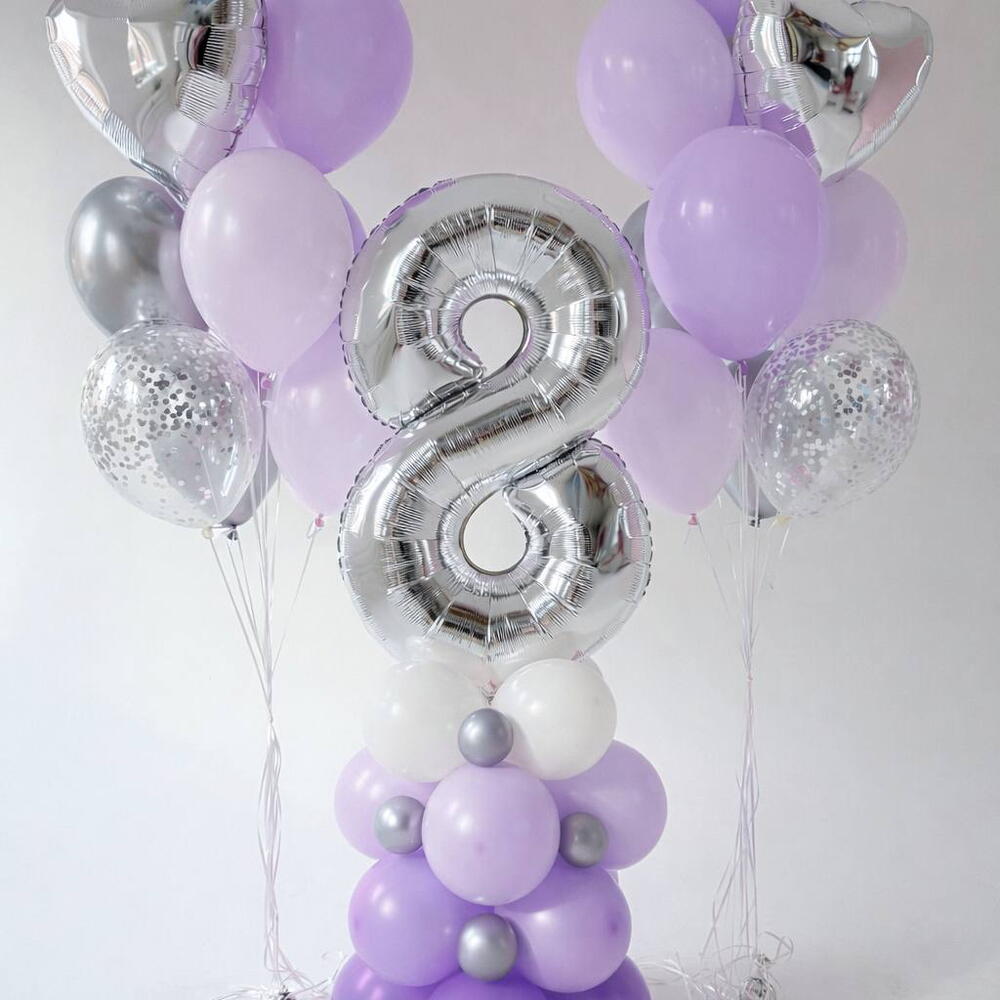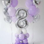 Set includes : - 2 bunches 10 balloons each - number 8 on balloon base