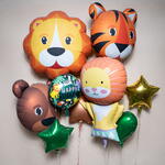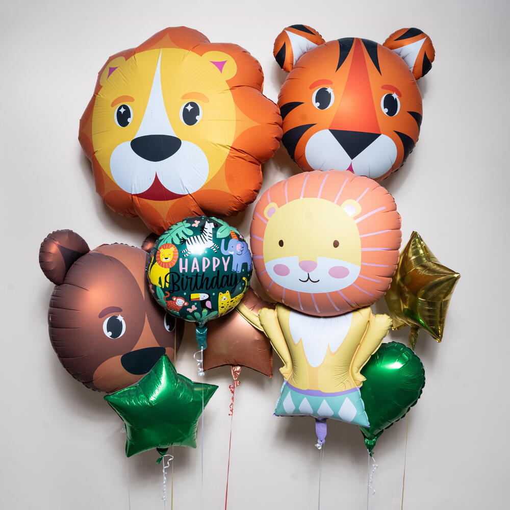 Lion Friends Jungle Theme Happy Birthday Foil Balloon Set — яркая и игривая композиция из фольгированных шаров, созданная, чтобы привнести атмосферу джунглей на детские праздники по случаю дня рождения. С милыми персонажами диких животных и яркими акцентными шарами этот набор создаёт захватывающую и радостную праздничную атмосферу. Количество шаров Включает (всего 9 фольгированных шаров): 1 фольгированный шар — мордочка льва 1 фольгированный шар — мордочка тигра 1 фольгированный шар — милый персонаж-лев 1 фольгированный шар — мордочка медведя 1 круглый фольгированный шар с надписью «С днём рождения» и джунглевым принтом 1 фольгированный шар — золотая звезда 1 фольгированный шар — зелёная звезда 1 фольгированный шар — коричневая звезда 1 фольгированный шар в форме сердца зелёного цвета Идеально подходит для вечеринок в стиле джунглей, дней рождения с животной тематикой, сафари-вечеринок, детских праздников и ярких фотозон — этот набор фольгированных шаров мгновенно украшает интерьер благодаря насыщенным цветам и дружелюбному дизайну животных. Изготовлены из высококачественной фольги, шары держатся на гелии примерно 8–10 часов, что делает их идеальными для мероприятий в тот же день, сюрпризов ко дню рождения и праздничного оформления 🎈🦁🌿
