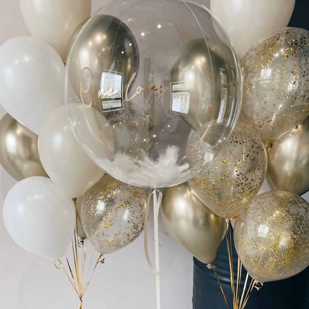 A bouquet of balloons for a birthday! 1 bubble 24” balloon with feathers inside, inscription and weight 2 bunches with weight: 3 Helium Latex chrome gold 12” balloons 2 Helium Latex white 12” balloons 2 Helium Latex white sand 12” balloons 3 Helium Latex clear 12” balloons with small gold confetti Product color may slightly vary due to photographic lighting sources or your monitor settings. All latex balloons are treated with hi-float for long flight. Also, the customer can be offered a replacement for a similar product.