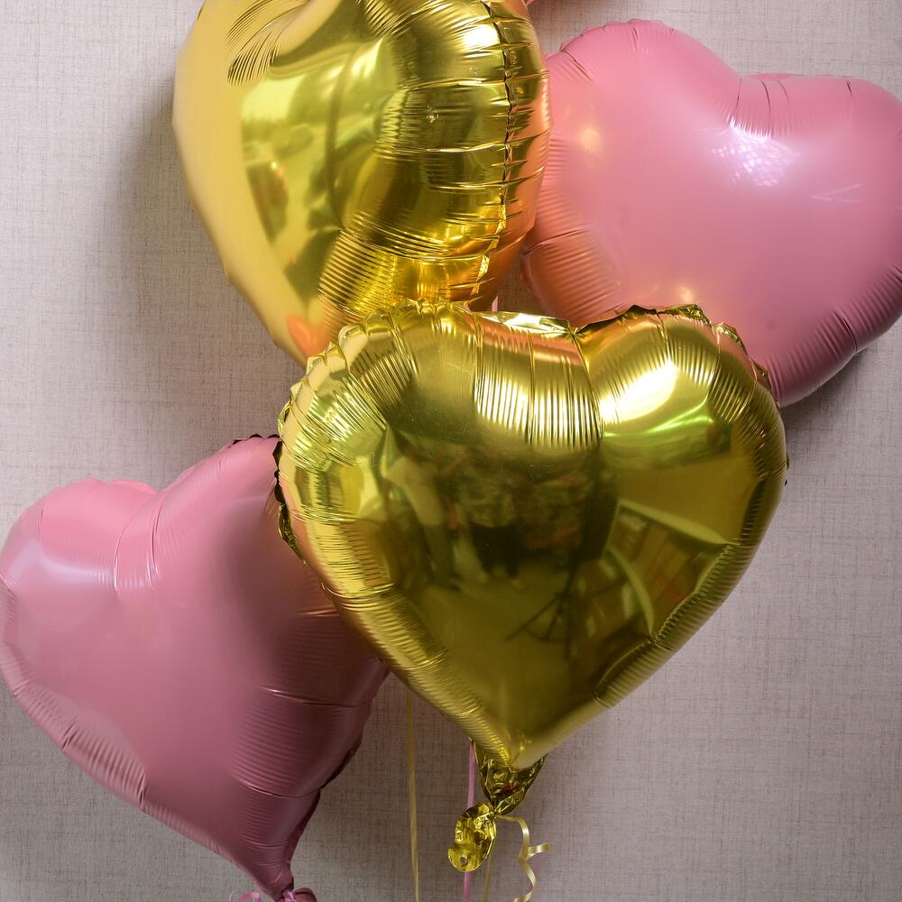 Включает тематический круглый фольгированный шар и четыре гелиевых шарика в форме сердца. ( 2 розовых шарика в форме сердца, 2 золотых шарика в форме сердца, 1 круглый фольгированный шар) надуты гелием с грузиком внизу, держатся 8–10 часов.