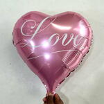 Розовый фольгированный шар в форме сердца с надписью «love» и наполненный гелием. Гелий продержится 8–10 часов